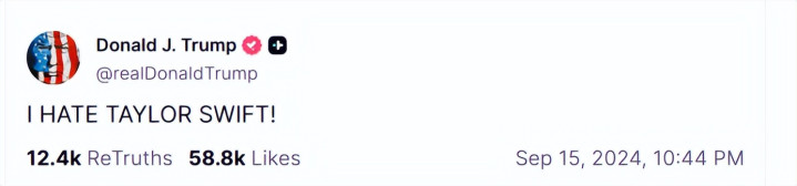 霉霉发布订婚官宣帖子后,短短几十分钟就收获了400万点赞,网友们纷纷祝福他们是天造地设的一对。值得一说的是,2024 年美国大选时,霉霉公开支持民主党人哈里斯,川普因此抨击她,当时发文道:“我讨厌泰勒・斯威夫特!”