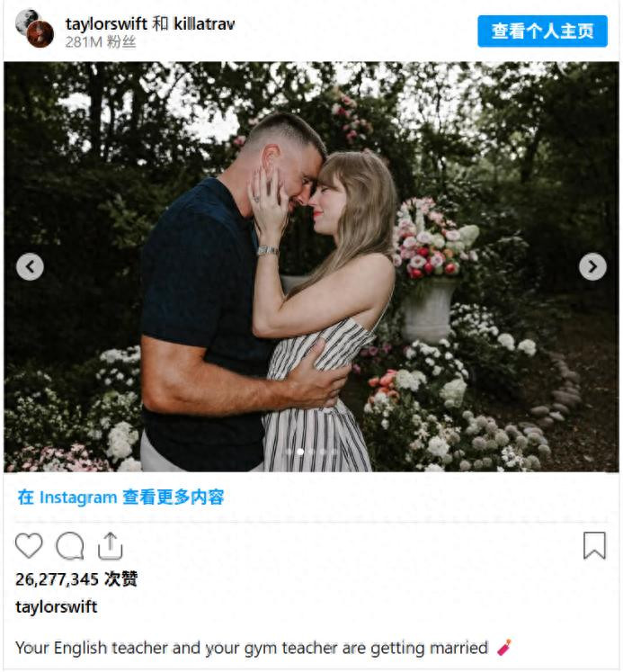 贴文写道:“你的英文老师和体育老师要结婚了”,同时附上特拉维斯在开满鲜花的花园里向她求婚的图片。