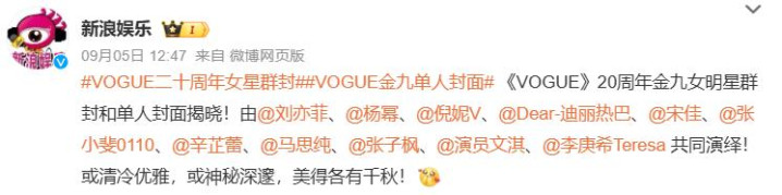 VOGUE时尚杂志为庆祝创刊20周年,9月5号推出了史无前例的“中国版”金九女明星封面。