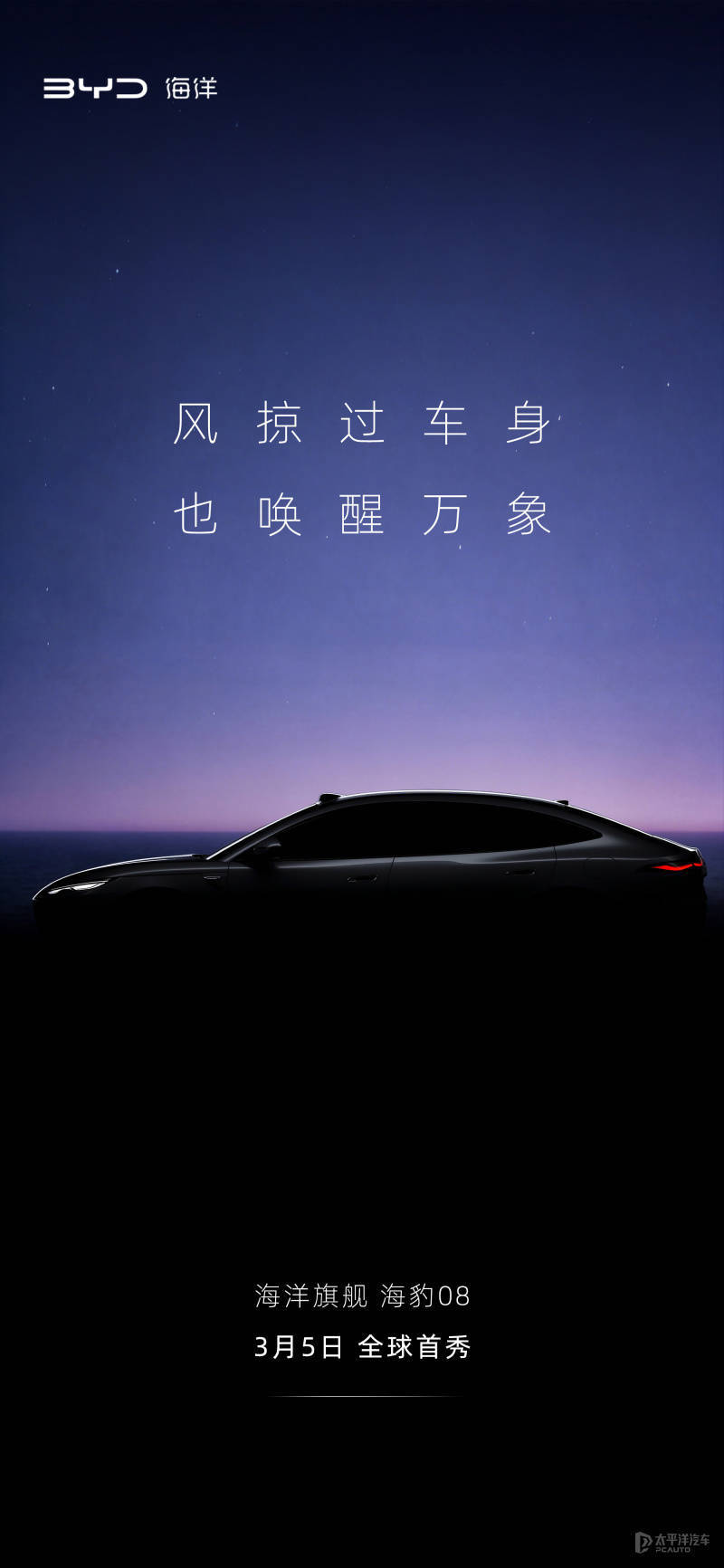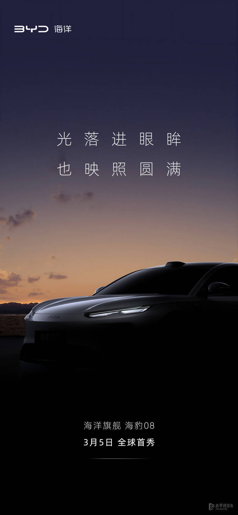 【太平洋汽车 新车频道】3月3日,比亚迪正式发布了海洋网全新旗舰轿车海豹08的预告图,并宣布该车型将于3月5日迎来全球首秀。作为比亚迪海洋网的最新旗舰产品,海豹08定位中大型轿跑,将集成最新的闪充技术、后轮转向、第二代刀片电池等多项前沿技术于一身。